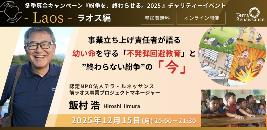 当日は、ラオスの「終わらない戦争」の現状と、子どもたちの未来を守るための具体的な活動について飯村がお伝えします。10月から新たにラオス事業マネージャーとして着任した新職員の紹介もいたします!