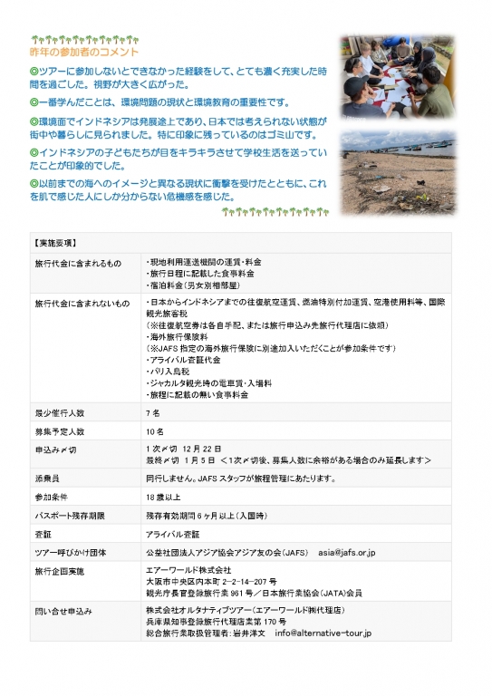 Tel 06-6409-4333 Fax 06-7635-8703 Mail info@alternative-tour.jp https://alternative-tour.jp/archives/jafs_indonesia.html