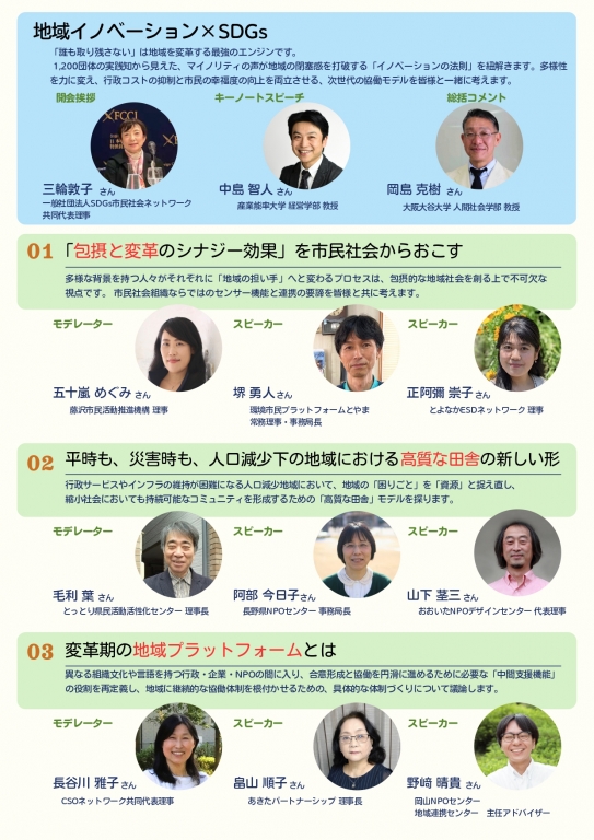 本オンラインセッションでは3年間のプロジェクトの取り組みを総括し、全国各地のサテライト会場から共有します。NPOや市民活動団体は、多主体連携のハブとなる存在として、また地域課題や地域の魅力を草の根の最前線で知る存在として、あるいは課題を成長に変換するイノベーションの担い手としての活躍が期待されます。各地の実践知に基づく持続可能な地域づくりのポイントを、地域行政の担当者をはじめとする多くの方々と共有することで、現場の実情を政策に結びつけていく未来志向の協働関係の構築を模索したいと思っています。