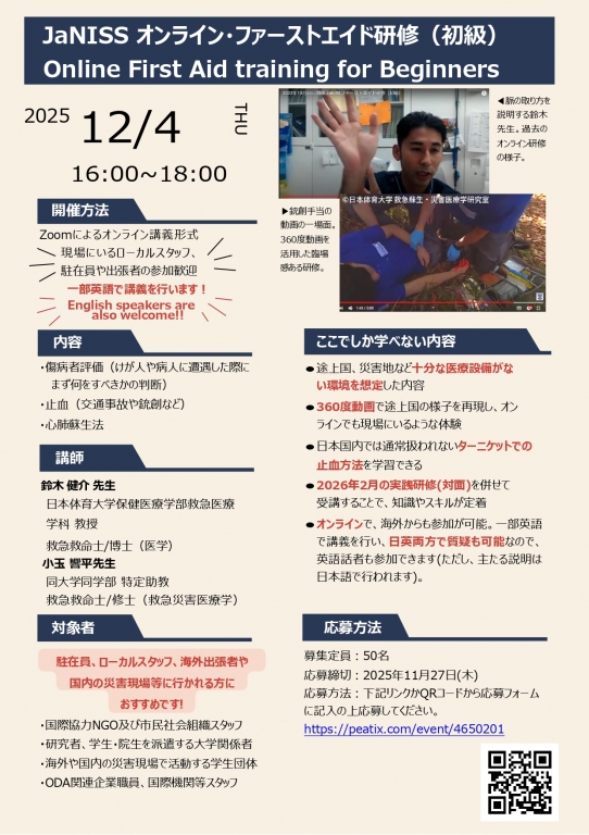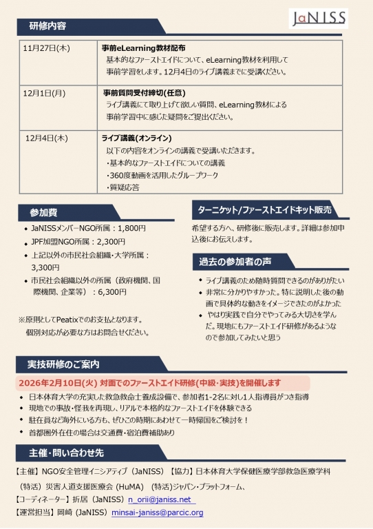 日本ではほとんど実施されていない、途上国を想定したファーストエイドをオンラインで習得いただける機会です。