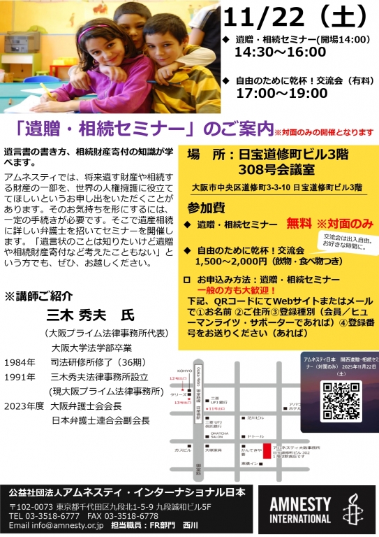 ※本セミナーはアムネスティインターナショナルに遺贈を誘導するものではありません。遺贈に関心をお持ちの方は、ぜひ気軽に足をお運びください。
