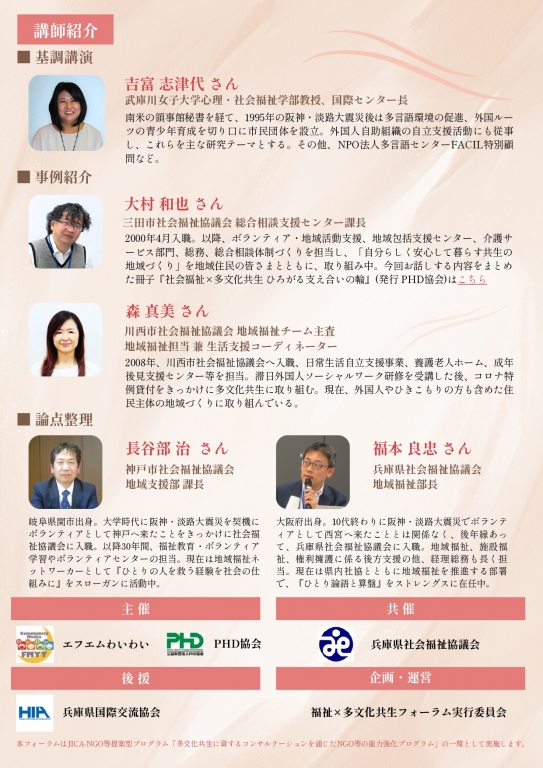 外国人住民が地域の担い手として参加し、活躍する多文化共生社会をどのように実現していくのか。本フォーラムでは、兵庫県内で多文化共生に取り組む社会福祉協議会の実践事例を紹介し、地域福祉の中核を担う社会福祉協議会の役割や、福祉分野と多文化共生分野との連携の可能性について考えます。