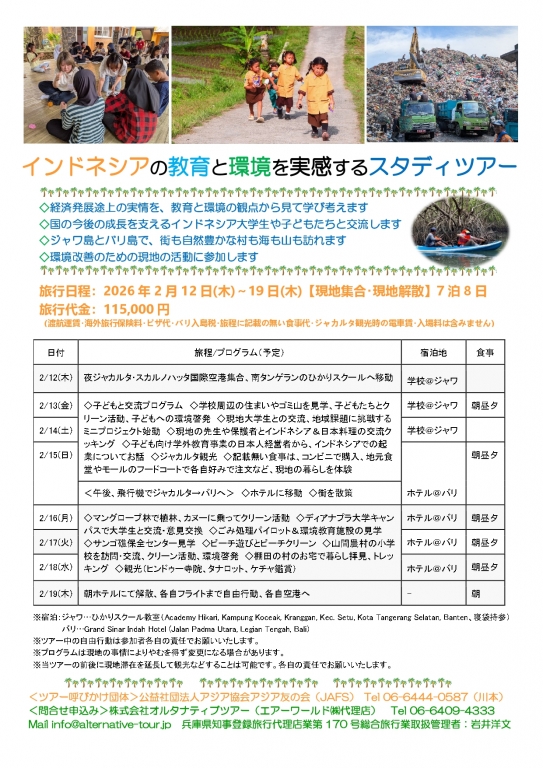Tel 06-6409-4333 Fax 06-7635-8703 Mail info@alternative-tour.jp https://alternative-tour.jp/archives/jafs_indonesia.html
