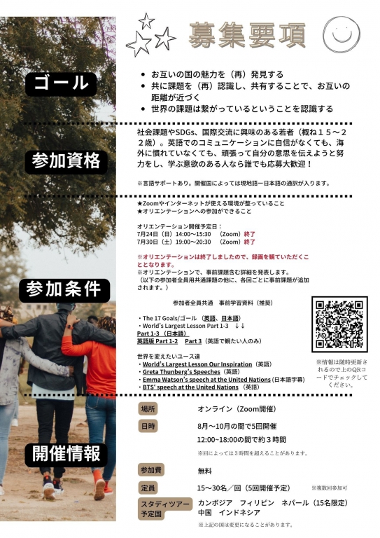 コロナ禍で海外に行く機会が減り、私自身を含め、悶々としている人は多いのではないでしょうか。日本にいながら、アジア5カ国を巡り国際協力について学べるスタディツアーと、現地のユースとの交流企画を組み合わせたスペシャルパックはなかなかありません!